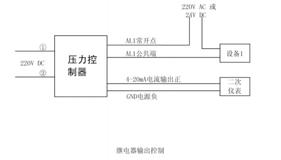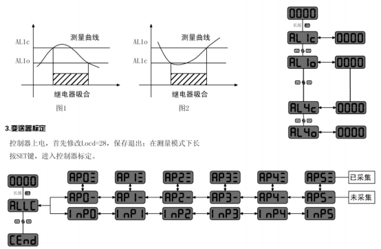 例:要設定開關點1為上線報警輸出(常開功能)在4.000MPa吸合,小于3.995MPa斷開,開關點為2下限報警輸出(常閉功能)在1.000MPa斷開,低于0.995MPa吸合進入菜單:設定AL1c=4000 AL1o=3995