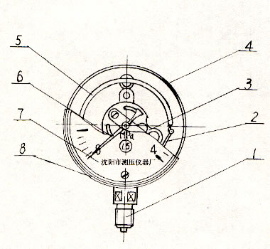 1.接頭 2.連桿 3.傳動機構 4.表殼 5.彈簧管 6.指針 7.度盤 8.罩圈